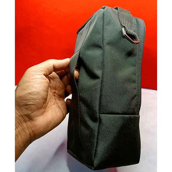 - The storage bag is attached to the waist belt and has a handle for carrying.